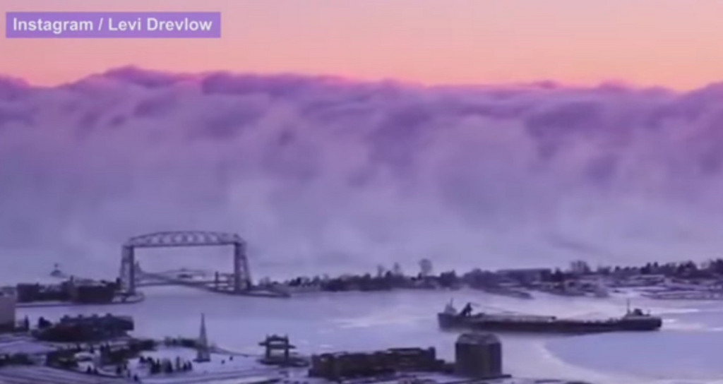 美國明尼蘇達州的杜魯斯港(Duluth Harbour)日前出現罕見的「霧牆」,外媒用「末日來臨」來形容此景象。杜魯斯港位於蘇必略湖畔,由於相對溫暖湖水碰上低溫空氣,水氣急速凝結成霧,才會形成這種少見的奇觀。