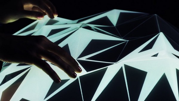 這個可以透光的幾何形狀表面也是不好弄的, 因為要打造一個可以透光, 適合背投影, 多點觸控, 結構穩固, 還要能檢測到手指動作的不規則表面, 實在是相當不容易. 在初期設計時, 建構了許多的複雜結構的紙模型, 來進行手部動作的測量, 最後確定完成之後, 使用了灰泥和玻璃纖維的材料來完成, 看到要打造一個這樣的裝置, 就覺得...好累.