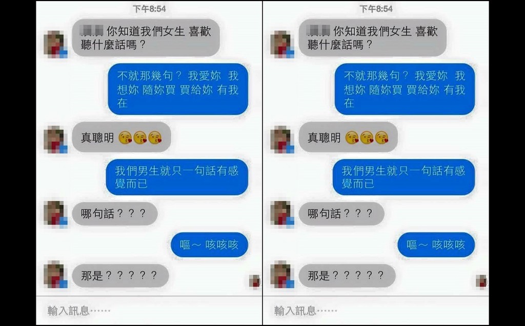 馬姓網友29日在「爆廢公社」貼文,分享一張臉書對話截圖,表示這是「很深的深度文」。根據對話,女孩先撒嬌問男友,「你知道我們女生喜歡聽什麼話嗎?」男友很聰明,嘴甜回應,「不就那幾句?我愛妳、我想妳、隨你買、買給你、有我在。」