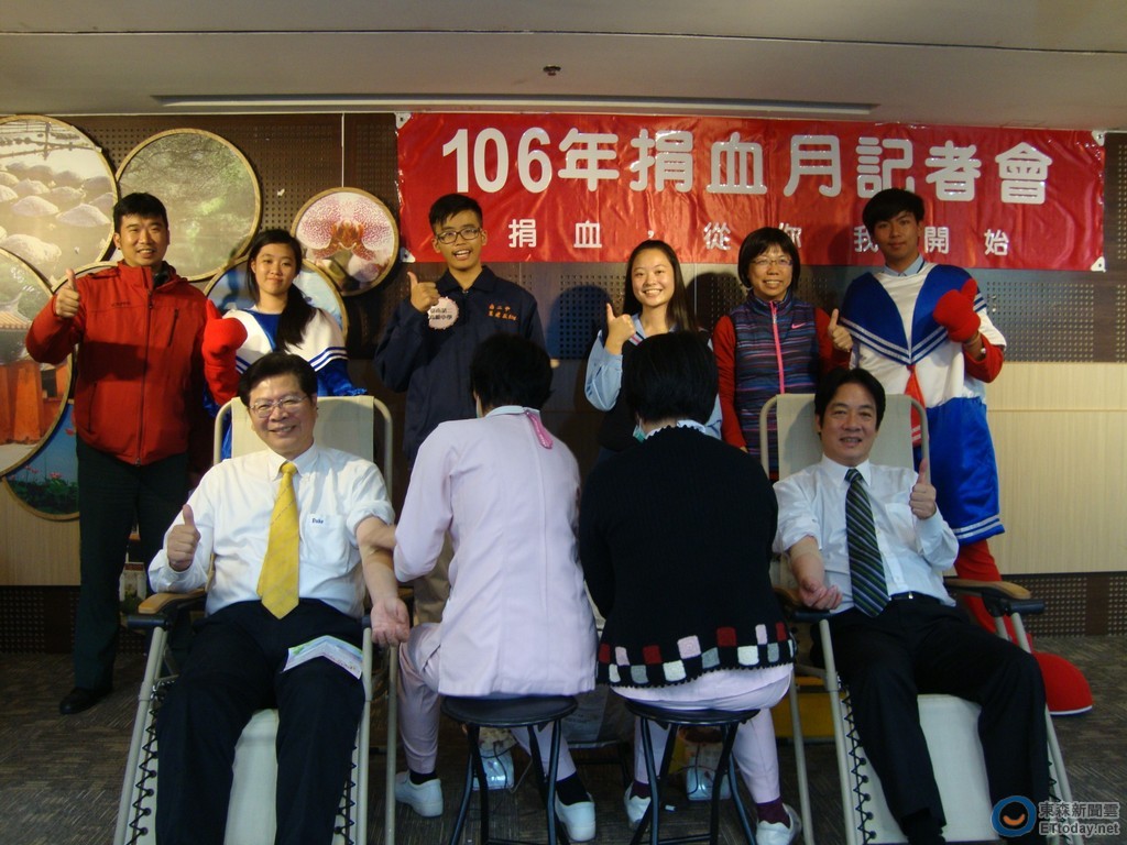 為響應捐血月活動,台南市長賴清德及衛生局長林聖哲等人,29日帶頭挽袖捐血,也邀請台南市士農工商各界、軍人以及學生分享捐血心得,鼓勵民眾踴躍捐血。