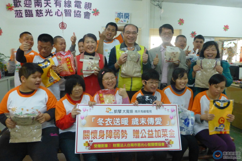 歲末天寒,南天有線電視秉持回饋鄉里,在台南市議員蔡秋蘭引介下,29日前往西港區慈光心智關懷協會舉辦「冬衣送暖、歲末傳愛」贈送儀式,由南天總經理劉中勝率領副總陳耀等人,致贈協會200件冬衣及加菜金,市議員蔡秋蘭加碼帶來沐浴乳、米粉泡麵等實用日常用品共襄盛舉,由慈光理事長徐育仁代表接受。