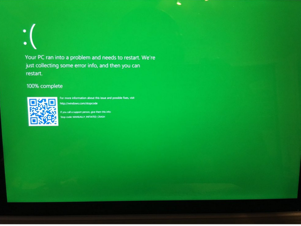 根據 Twitter 用戶 Chris123NT 曝光的圖片中,可發現原本 Windows 10 在當機況狀下顯示的藍畫面,搖身一變為綠色,雖然供檢查診斷當機原因的 QRCode 仍然存在,但綠油油的一片實在有點奇怪,畢竟從早期的 Windows 系統中,藍畫面可是不少玩家心中的痛啊!