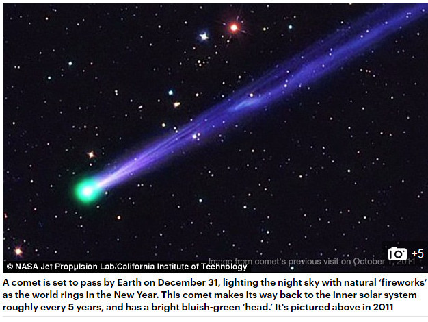 據《每日郵報》報導,NASA今公布在2016年12月31日跨年之時,將有一顆名為「45P/Honda-Mrkos-Pajdušáková」的「綠頭」彗星回歸太陽系,從天空畫過,45P彗星是一顆週期為5.25年的彗星,上次經過的時間為2011年,這次回歸太陽系是於英國時間12月31日晚間18時30分,不過換算台灣時間為2017年1月1日凌晨2時30分,也將成為民眾迎接2017年的最好禮物。