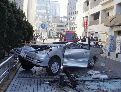 有目擊者指出,這輛轎車突然衝破停車場的圍欄,以倒掛的方式摔落地面,還聽見車內有男童直喊「痛!痛!」。目擊者說,附近民眾見狀紛紛聚集,還集合駐日美軍到場幫忙抬起汽車,將受困傷者拉出。