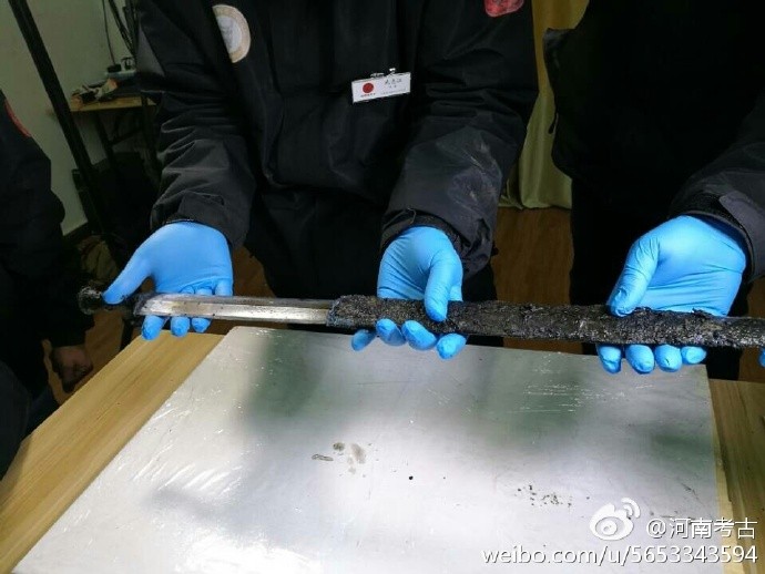 考古團隊在19日將主棺從墓葬中吊出,並運至考古博物館內的保護房中進行檢測和開棺,並在棺木內發現一柄有鞘的大寶劍。這柄2000年前的寶劍外鞘已經有點腐爛,考古人員拔劍的時候可以清楚發現鞘身掉出許多碎屑,但劍身一出鞘,竟還寒光閃閃,保存得非常良好,讓許多人驚呼出來!