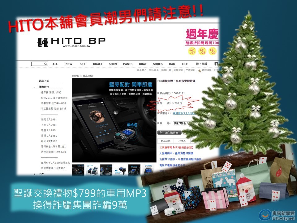 刑事局指出,張姓男子是在去年11月,透過網購站「HITO本舖」用線上刷卡花799元買了一個車用MP3播放器,要拿當作聖誕節的交換禮物。沒想到聖誕節都過了,卻接到一通自稱是「HITO本鋪」客服人員電話,說是因為員工作業疏失,不小心把訂單設為12期分期付款,不趕快處理,每個月銀行就會扣款799元。