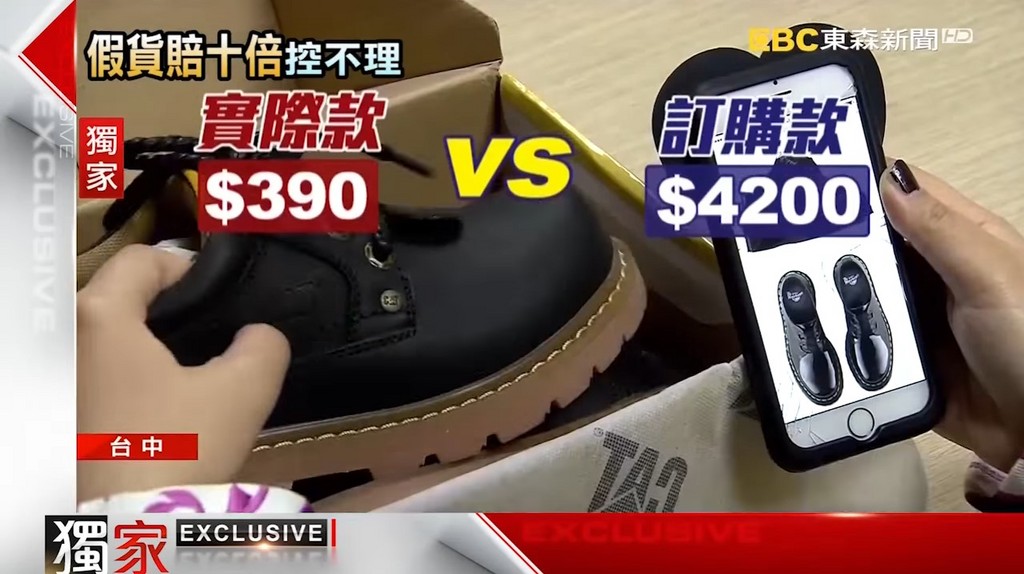 ▲李同學指控,上網看到4200元馬丁鞋,以為撿到便宜下訂,結果收到390元的夜市貨。(圖/東森新聞,下同)