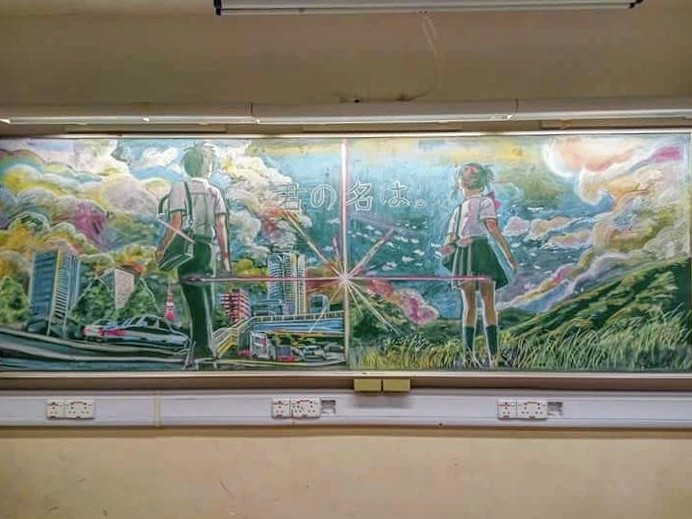 電影《你的名字》爆紅,唯美畫風更是捲起熱潮,香港有2名高中女學生竟然只用6色粉筆,就在黑板上復刻絕美海報,立刻掀起討論,她們說,實在是太喜歡那部電影了,「不得不畫」。而網友也紛紛讚嘆兩人的作品,直呼「 畫得好靚」、「神人」、「好勁啊」。