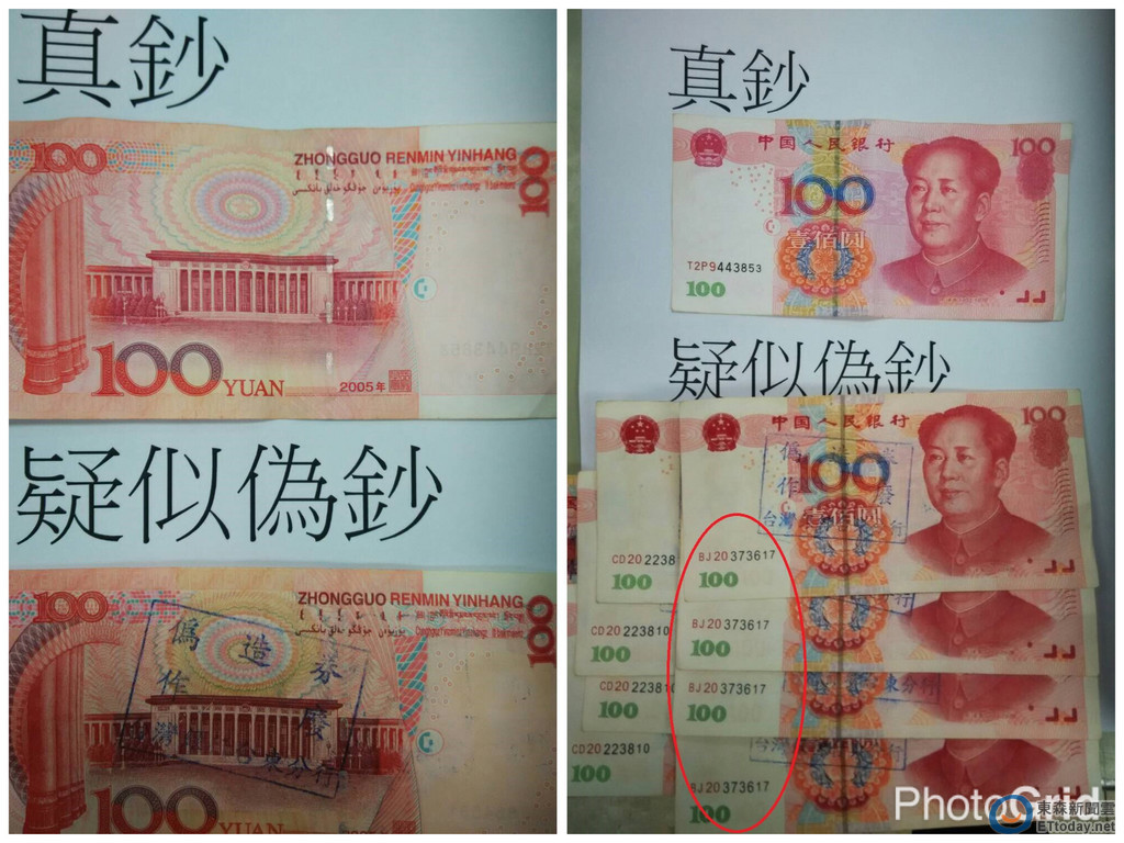 結果行員用放大鏡檢視,並與真鈔比對,果然其中17張百元人民幣不僅編號相同,紙質、色澤、防偽便是都和真的差很大,立即依據《偽造變造外國幣券處理辦法》,將這一批偽鈔加蓋印章作廢,並由員警送交轄區派出所進一步偵辦。