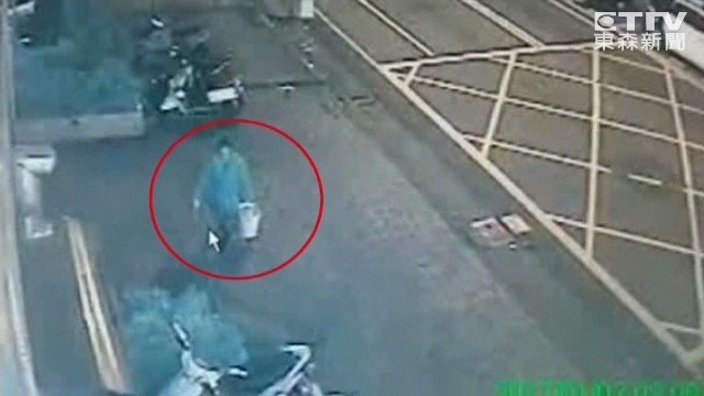 ▲廖男提著疑似裝有易燃溶劑的桶子前往派出所。(圖/東森新聞,下同)