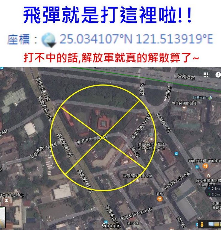 由一名網友成立的《2017罷免蔡英文聯盟》中,今日上傳一張詳細標註官邸座標的Google 地圖,並在圖片上寫著「飛彈就是打這裡啦!」,在中國航母「遼寧號」艦隊日前繞過台灣東部外海,至南海展開訓練的敏感期,該名網友心態實在可議。