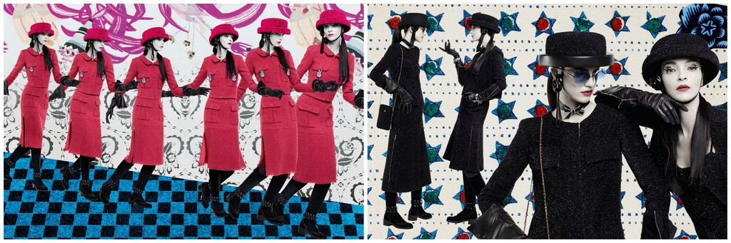 Chanel 2016秋冬系列廣告大片,由超模瑪麗亞卡拉波斯克諾Mariacarla Boscono與Sarah Brannon共同出鏡。在卡爾拉格斐 Karl Lagerfeld 的藝術美學下,模特兒以多重剪影輪廓展現連續動作,鮮豔的背景則以山茶花、Emoji表情符號和珍珠鏈拼貼,呈現趣味十足的現代藝術。