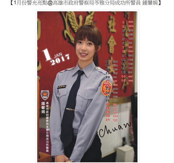 今年元月的「警光亮點」之一是高雄市警局苓雅分局成功路派出所女警鍾馨娟,目前負責有關婦幼家暴業務,經常處理夫妻糾紛感情等問題;由於長相清純可愛,又有一雙長腿,曾在值勤時被問「能不能加LINE」。