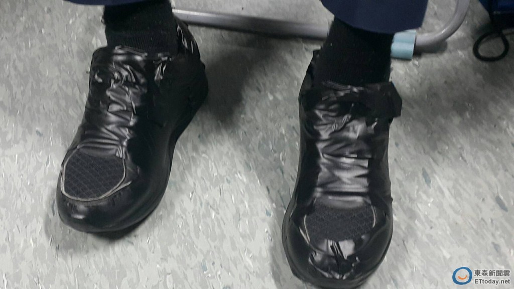 ▲比賽沒黑皮鞋,球鞋貼黑膠帶假裝成皮鞋。(圖/化仁國中提供,下同)