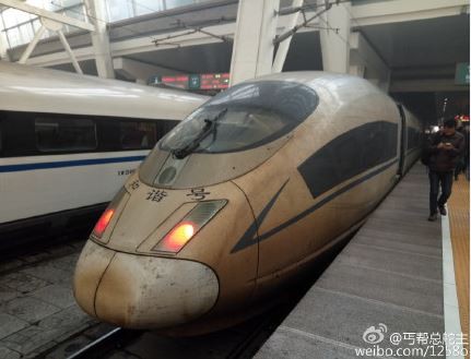 一名網友在微博上發表了一篇「這是一輛穿過霧霾區的高鐵」的文章,並表示這輛列車是由上海開往北京南站,在經過華東、華北的霧霾重災區後,沒有經過雨水的沖刷,才會變成現在的樣子。