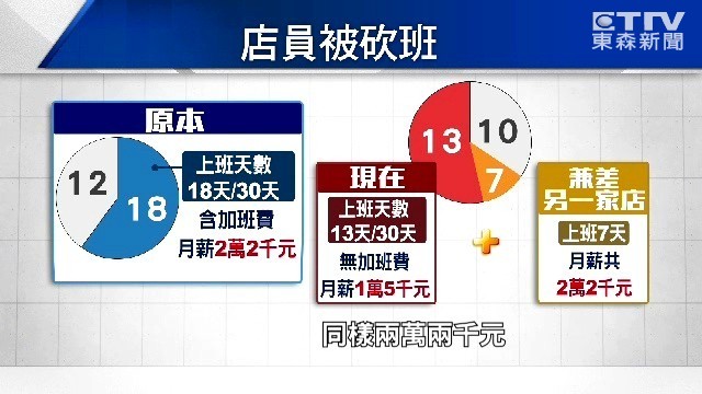 以這位全家超商員工林先生為例,他原本每個月有18天班,包含加班費月薪大約2萬2千元,今年1月新制上路後,一個月少了5天班,加班費也沒了,月薪只剩下1萬5千元,他只好到另一家全家超商兼差,但要賺到22k必須比過去多上2天班。
