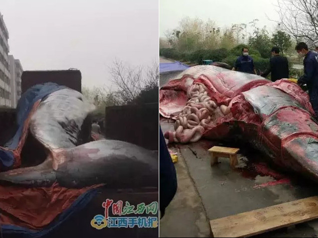 5日江西省網友拿照片向《江西網》爆料,說著自己公司太瘋狂,用拖板車在來一條8公噸的大鯨魚,放在公司前,打算分屍後餵狗。圍觀民眾從沒看過這麼大的鯨魚出現在眼前,更何況鯨魚當場被電鋸分屍,魚腸散落體外,馬路上更是充滿血跡與腥臭味,讓人直呼:實在恐怖!