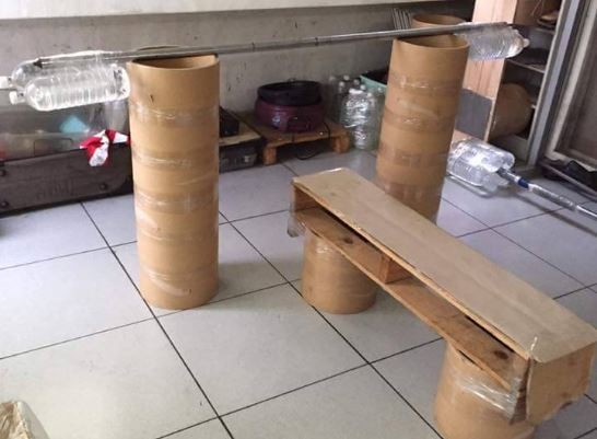 據了解,臉書粉絲專頁「爆料公社」7日下午分享一則貼文,一名網友在某工廠的2樓發現外籍移工自製的健身器材,讓他直呼「只要肯用心,保特瓶也能變槓鈴!」根據照片,製作者利用裝水的寶特瓶和鐵棒做成槓鈴,並以2個紙筒作為支撐架,接著還用廢棄木櫃製成臥推時要躺的長凳,不僅發揮DIY精神,又兼顧環保,實在很有創意。