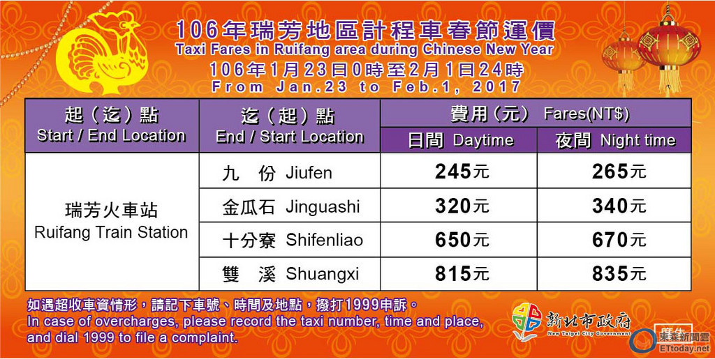 新北市為體恤小黃運將春節服務辛勞, 106年計程車春節加成收費將與北市、基隆市自1月23日零時起至2月1日24時止,同步實施計10天。若駕駛未使用新式計費表功能將春節加成20元直接計入跳表金額或仍使用舊表的計程車不得額外加收春節加成費用。瑞芳及烏來地區固定路線春節加成則依公告之固定運價收費。