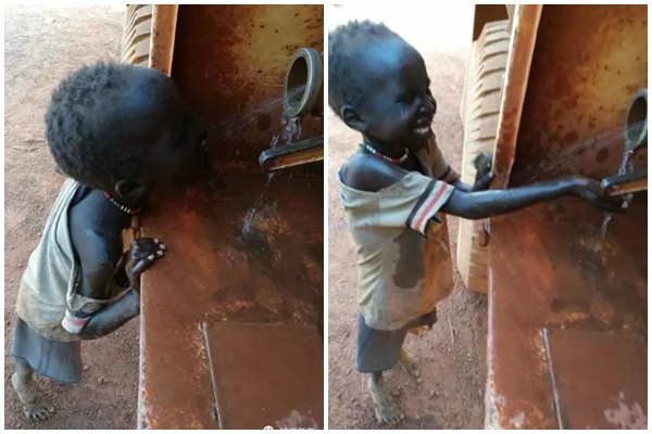 南蘇丹持續內戰衝突,民不聊生,一名4歲男童Bol穿著破舊衣物,光著腳ㄚ尾隨中國維和部隊的車隊,只為了想喝一口水。當時男童撲到閥門前,由於力氣太小扳不動開關,工兵連勤務保障中隊長尹國強趕緊打開閥門,他馬上翹起腳尖,將臉湊上去大口地飲水,畫面讓人鼻酸。