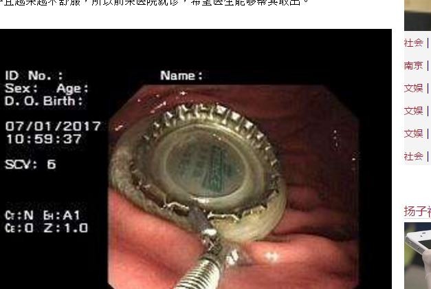 江蘇連雲港市一名劉姓男子喝啤酒太過豪邁,竟然連酒瓶蓋也一起吞下肚,灌完整杯才發現不對勁。醫生巨衛平考慮到酒瓶蓋邊緣十分鋒利,於是轉而先用保險套套住瓶蓋再取出,過程不到2分鐘!