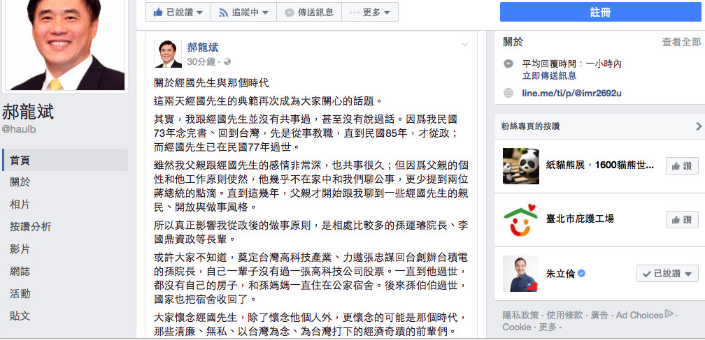 ▲郝龍斌談蔣經國、孫運璿。(圖/取自臉書)