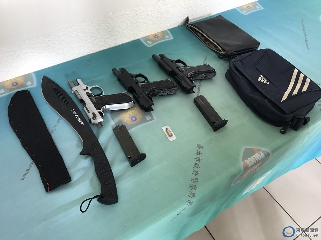 台南市中西區金華路於8日上午11時許,有2名黑衣男子共乘1輛機車,前方男子左手持槍對剛離開之自小客車對空鳴槍,後座男子則右手持開山刀憑空揮舞,行徑怪異,市警二分局據報,10日循線前往20歲張姓犯嫌處搜索,起獲改造手槍、子彈及安非他命,全案偵訊後依槍砲、毒品犯罪嫌送辦。