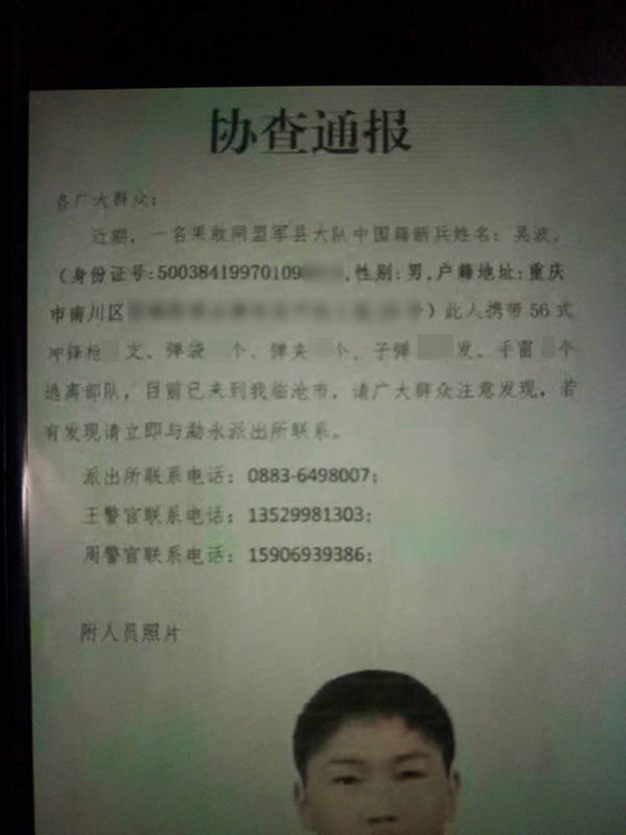 ▼網路流傳協尋通報,一名中國籍果敢同盟軍新兵逃離部隊,攜帶槍枝進入雲南境內。(圖/翻攝自澎湃新聞網)