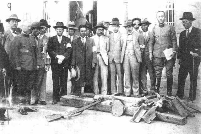 ▼日人在九一八事變中使用的「證物」,幾件東北軍的制服、一支步槍,以及兩根鐵道枕木。