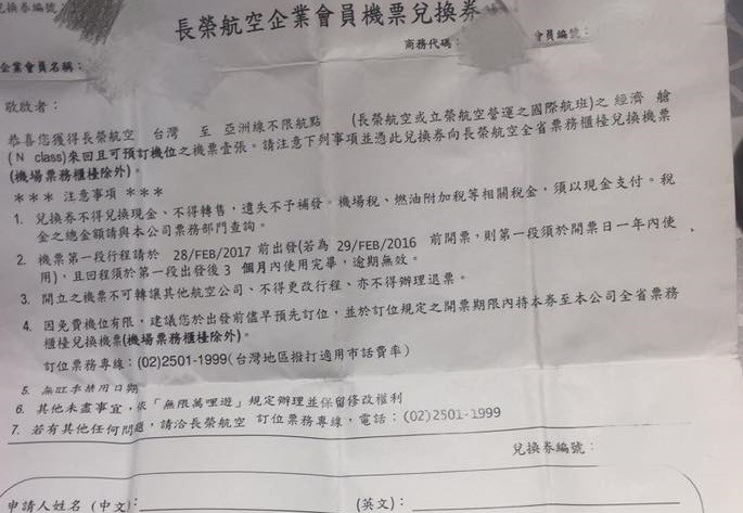 網友在「爆廢公社」貼文表示,「尾牙抽到這個不知該哭該笑,單人機票...已哭」。從照片中可見,這是長榮航空亞洲線不限航點的「單人機票」兌換券,須在2月28日前出發,且回程要在出發後3個月內使用完畢。