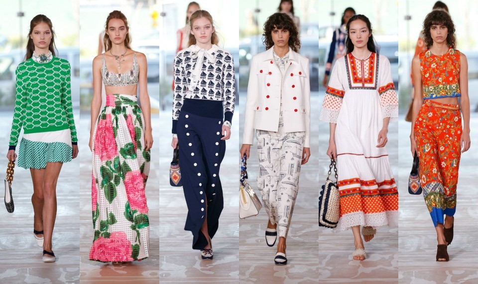 從綠意盎然的花園派對開始:長及地的裙擺半截裙配以不同比例的露腰短上衣,色調多以淡粉紅色與綠色組合,幾何形的花卉圖案,今季主要透過一種布料的混合效果來達至海岸風格的對比 – 由粗麻布和棉質針織,以至山東絲和迷人的fil coupe,感受到春天美好的畫面。再走到海軍風:層次分明的剪裁 – 高腰、闊腳水手褲及較男性化的外套,並用經典的學院風尚海藍色與鮮紅色配搭,穿插里格特條子花呢和航海印花,以及裝飾。拼貼、流蘇花邊和珍珠等細節延長設計效果,緊接著走入波希米亞風格的蠟染和拼貼花卉圖案,並以一款獨特的浪花印花圖案呼應滑浪的情景,當偏向西岸風格時設計則變得較為溫和,有飄逸的裙子、寬鬆的上衣和短褲,先入黃色和長春花色(藍色和紫色),再以白色、象牙色和黃沙色等柔和的中性色調作調和。