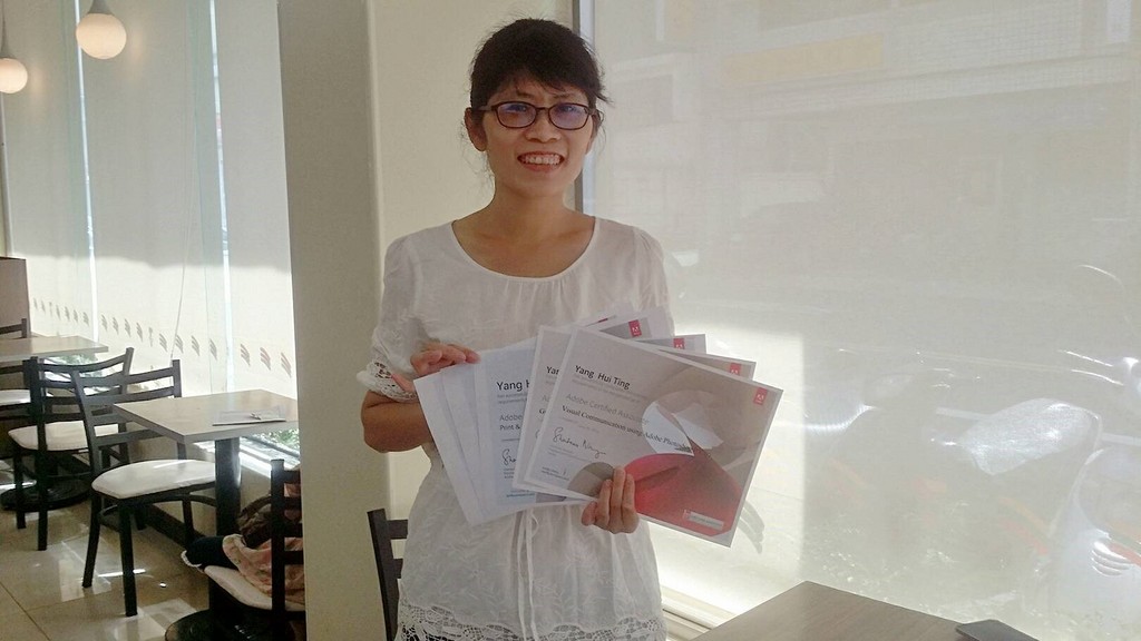 「沒想到能順利考取5張ACA證照,真的『好開心』!」楊惠婷表示,玩平面設計最吸引人的地方,除了資訊傳遞,莫過於讓觀看者發現在設計中孕含創作者的巧思。現在開設個人網拍工作室的她,形容這段築夢的過程是「破繭而出」,也以自己的故事鼓勵其他待業中的朋友能多利用市府的職訓課程和相關輔導,「勇敢實現夢想」。