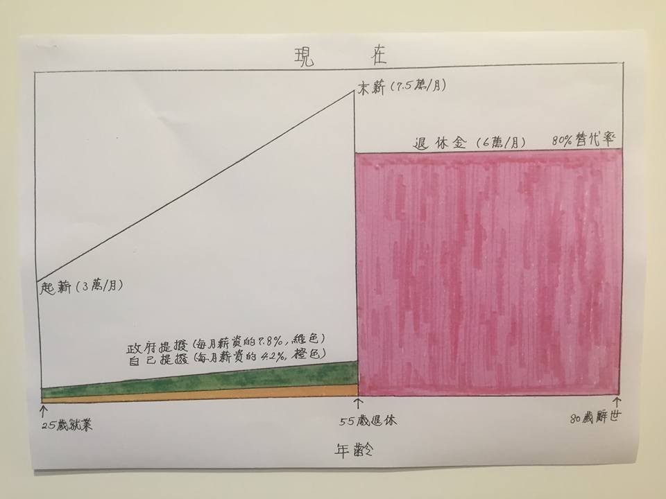 首先,陳建仁先以現制圖說明指出,在現在的公務人員退休制度下,一位25歲就業,每月領3萬元薪資的年輕人,工作到55歲退休時,每月可領7.5萬元的薪資。在30年工作期間,政府每月提撥薪資的7.8%(綠色),自己繳交薪資的4.2%(橙色)納入退休金。退休金以退休時薪資的80%替代率計算,每月可領6萬元,直到80歲辭世時,可領到的退休金總額(粉紅色),「遠遠大於工作期間存入基金的總額及其投資報酬」。