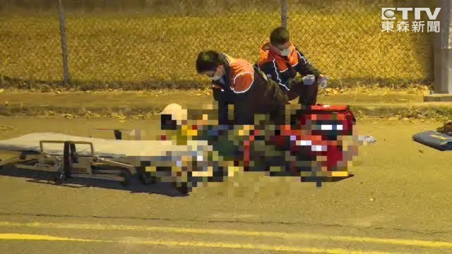 今天凌晨2點多北投大業路傳出火警,曾姓義消接獲通報後,立刻騎機車趕赴現場,但不明原因整輛車向右偏,接著撞上電桿,事故現場滿是血跡,機車零件散落一地。