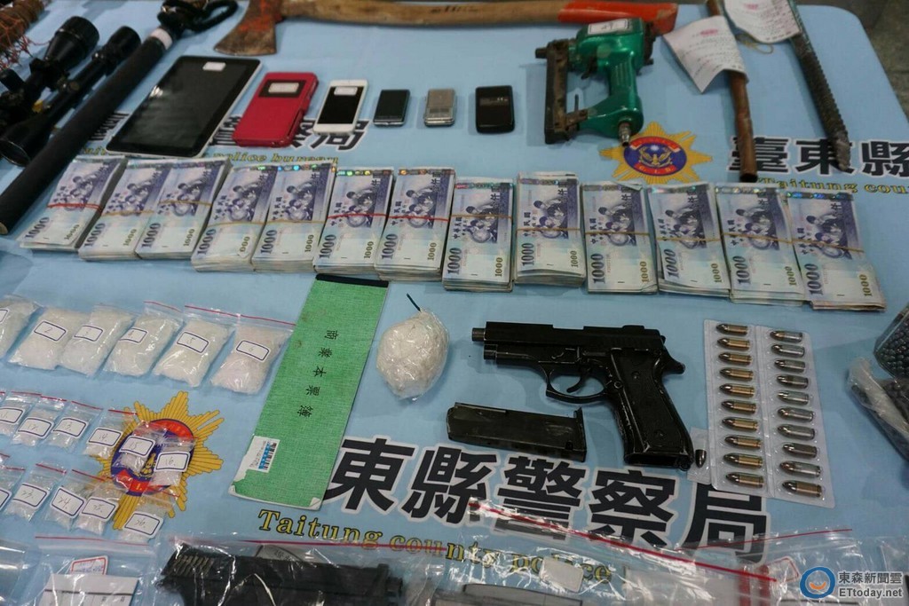 ▲台東警方偵破以35歲王姓男子為首暴力販毒集團,起出手鎗、子彈、安非它命等證物,全案移台東地檢署偵辦。(圖/台東縣警察局提供 下同)