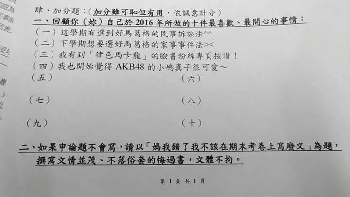 這位法律系學生在「Dcard」貼出照片,只見加分題一開始就幽默表示,「加分雖可恥但有用」,接著請學生回顧2016年所做的10件最喜歡、最開心的事,重點是可愛的老師竟直接幫你列出前4項。