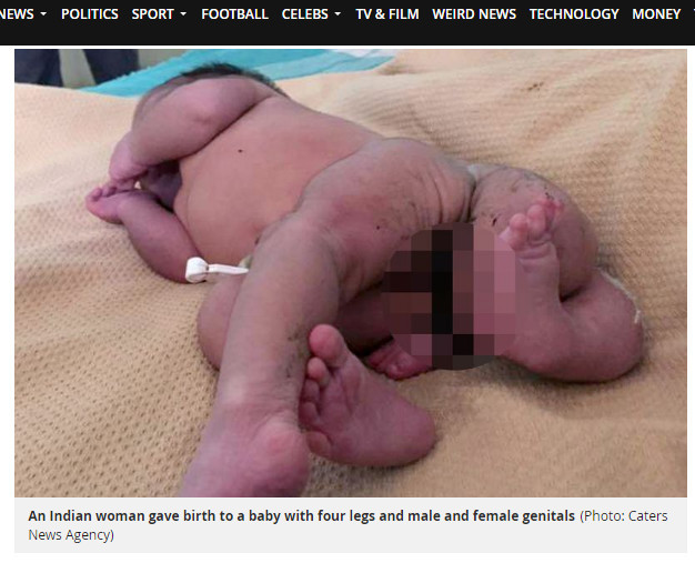 英國《鏡報》報導,蘇樂卡(Sulekha Mori)因9日腹痛到寶旭納(Poshina)公立醫院就診,才發現自己即將臨盆,經過2小時的自然產,終於將孩子生出。但主治醫生達比(Kakubhai MaganbhaiDabhi)卻告知他們,這是個不正常的「寄生龍鳳胎」,必須動手術將多餘的腿移除,同時以整形手術重新建構嬰兒的生殖器。