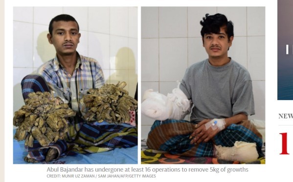 孟加拉一名男子巴強達(Abul Bajandar),身體長出如樹皮一般的肉疣,因此被稱做為「樹人」。罹患這類罕見疾病的他,接受院方的手術之後,目前已經摘除了手腳共5公斤的肉疣。未來若是巴強達不再長出肉疣,他將成為首例治癒「樹人症」的成功案例。