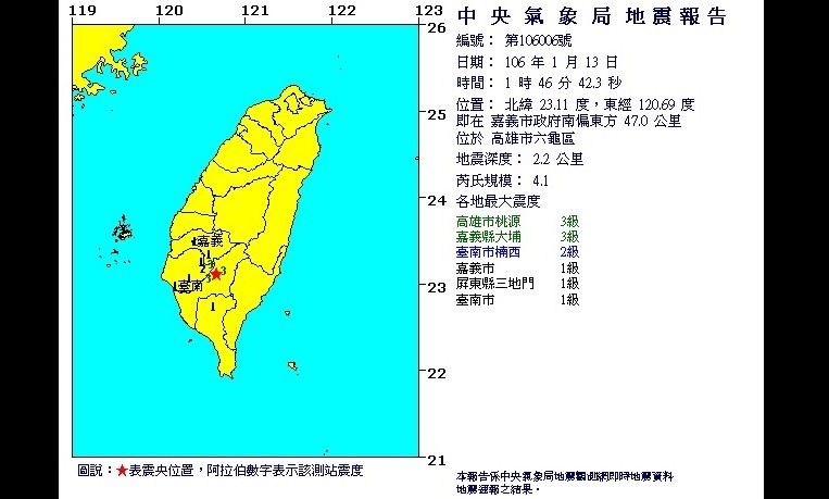 ▲繼昨日南台連3震,13日凌晨1:46高雄六龜再度發生4.1地震。(圖/中央氣象局)