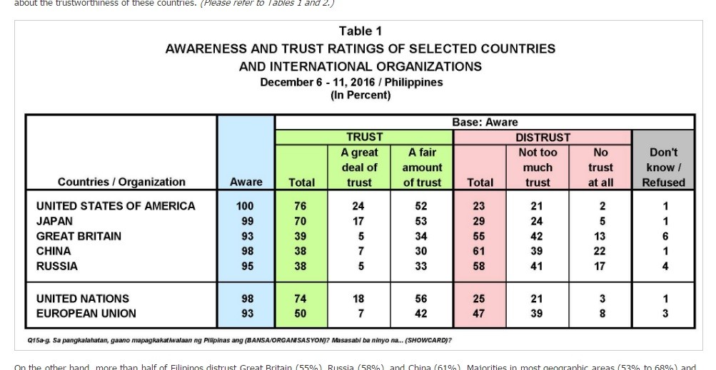 民調中,菲律賓民眾信任美國的比例高達76%、日本70%、英國39%,中國與俄羅斯為38%。譴責杜特蒂「掃毒行動」的聯合國有高達74%人信任,25%表示不信任;歐盟的信任度則是50%,不信任為47%。