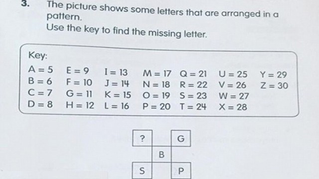 其實這道題目,是要訓練學生找出這當中的邏輯關係,但不少大人卻是把這題目和答案想得太複雜,答案其實是「J」。因為你只要找出「B」、「G」、「P」、「S」代表的數字,分別是6、11、20、23,其中「G」、「B」、「S」是一條斜線,加起來的數字總合是「40」,若是同樣道理,「P」、「B」和左上角是連成一條斜線,加起來的數字總合也是「40」,「P」代表的數字是20,「B」的數字是6,左上的數字就得是14,相對應的字母就是「J」。