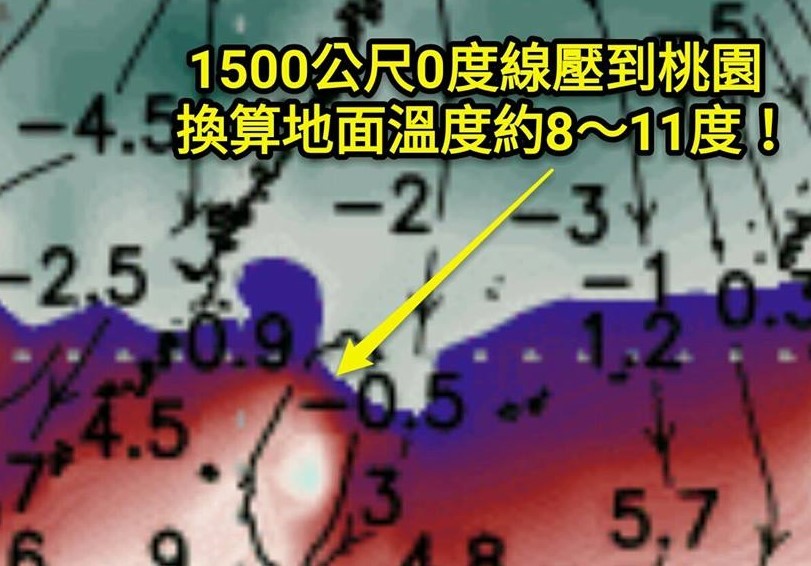 ▲「福爾摩莎氣象萬千」臉書粉專說,下周五「大寒」當晚,「1500公尺0度線將壓到桃園一帶,換算地面溫度將有機會出現8到11度的低溫。」(圖/翻攝「福爾摩莎氣象萬千」臉書粉專)