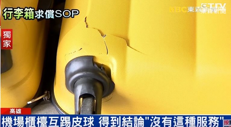 高雄一名林姓女子搭乘廉價航空酷航到韓國旅遊,行李箱在運送過程中遭損毀,左下角破開大洞,她當下拿到機場櫃台,但服務人員卻互踢皮球。最後得到結論,因為酷航在這邊沒有地面代理,所以無法受理理賠服務,讓女網友直呼「真的很傻眼」。