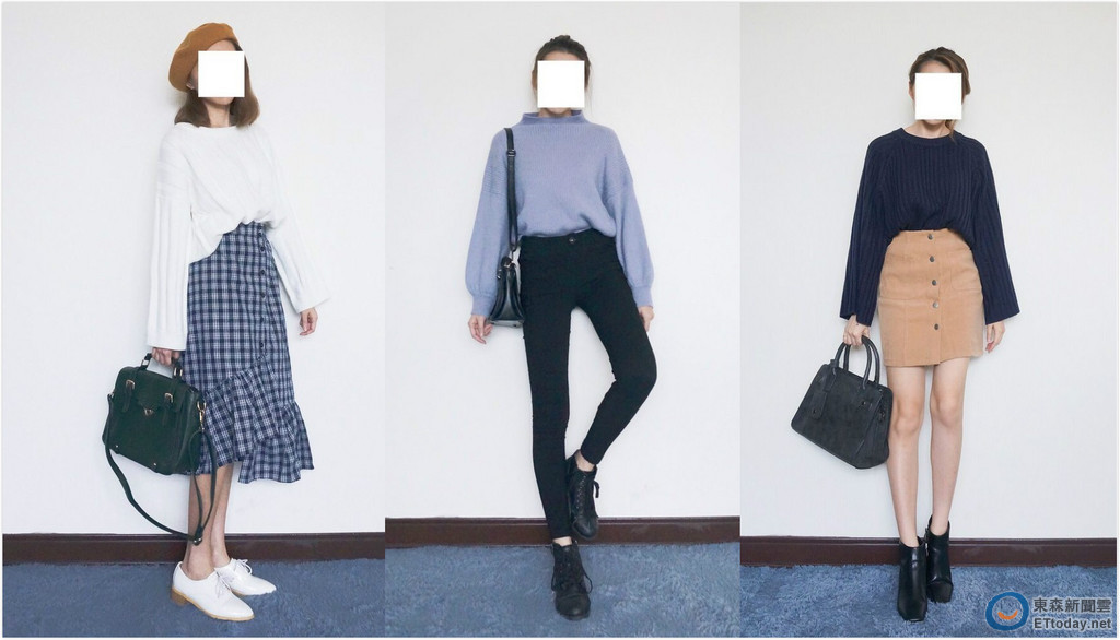 這名正妹在「Dcard」分享穿搭術,她提到「這波寒流來之前天氣很溫暖,是很多太冷不能穿的衣服,最好的上場時機」。她以深藍色、淡紫色、白色等寬袖毛衣,搭配駝色排釦裙、黑色高腰褲及高腰A字裙,再加上萬年不敗黑色短靴,不但營造出一種氣質、個性美,還把身高158,穿出170的感覺。