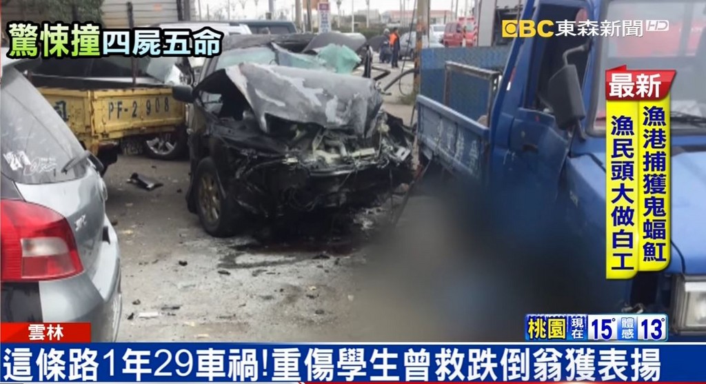 雲林麥寮15日一場嚴重車禍造成4屍5命的慘劇。警方初步調查,是吳男駕駛的白色轎車違規左轉,撞上直行的黑色轎車而釀禍,詳細責任還有待釐清。而駕駛黑色轎車的吳男無照,原載著弟弟和友人外出,但兩人都被彈出車外、當場死亡,只剩18歲的吳男重傷還在醫院治療。