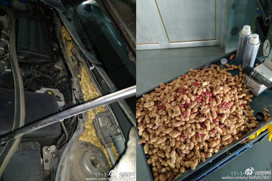 山東省日照市下轄的東港區一名男子14日在修車時,引擎蓋一打開,發現裡面堆積著滿滿的花生,事後,才知道是老鼠幹的好事,讓他哭笑不得,並將照片上傳至微博,引起多網友討論,有些人認為超級噁心,也有人開玩笑的說,「人家老鼠辛辛苦苦存著過年,結果你一口氣全清了,讓不讓過年阿?」