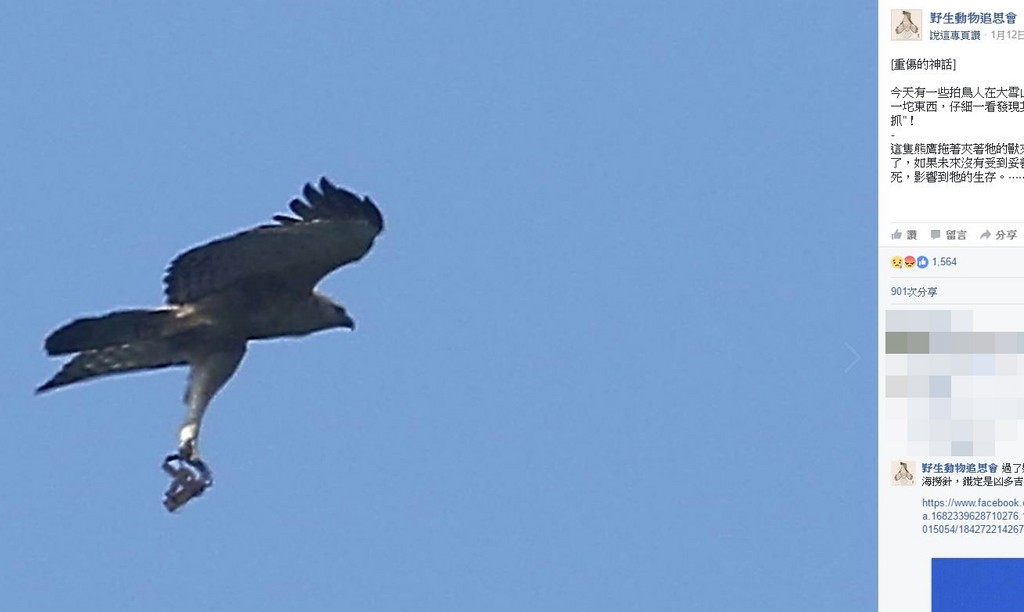 ▲大雪山拍到熊鷹高空展翅,腳上竟掛著捕獸夾。(圖/翻攝自野生動物追思會粉絲專頁)