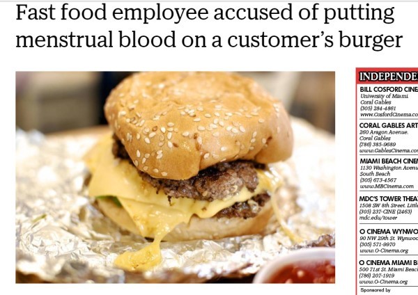 根據《邁阿密先驅報》(Miami Herald)報導,這則訊息是當一名女士霍林絲(Tabatha Hollins)日前在自己的臉書踢爆。她提到自己的16歲的女兒,先前是這家連鎖速食店的工讀生。7日當天,她在上班時意外發現,店內一名女同事在製作漢堡時,竟然在番茄醬內添加了「經血」,而且還把夾入漢堡內的起司舔了幾下。