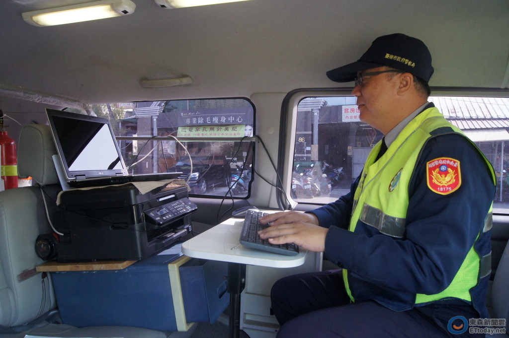 台南市警二分局交通分隊警員楊振輝、許筑鈞,處理轄區永華路與文南街口交通事故,以自備之手提式筆記型電腦設備,架於事故處理車上,立即將事故相關資料鍵入紀錄,並於製作完成後將登記聯單(圖/警方提供),於現場交予事故當事人,提升通事故處理效率,為民服務工作,獲民眾肯定。