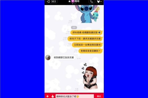 有網友在臉書社團「爆廢公社」分享自己和母親在LINE對話的截圖,從圖片中看到,「呼叫老媽,老媽聽到請回答!妳兒子下班,請求支援請求支援。立刻加派一台車送我回基地,老媽長官是否聽到?」沒想到老媽竟然回「收到!總部已加派支援!」原po回了一個「哈哈哈」的人物貼圖。